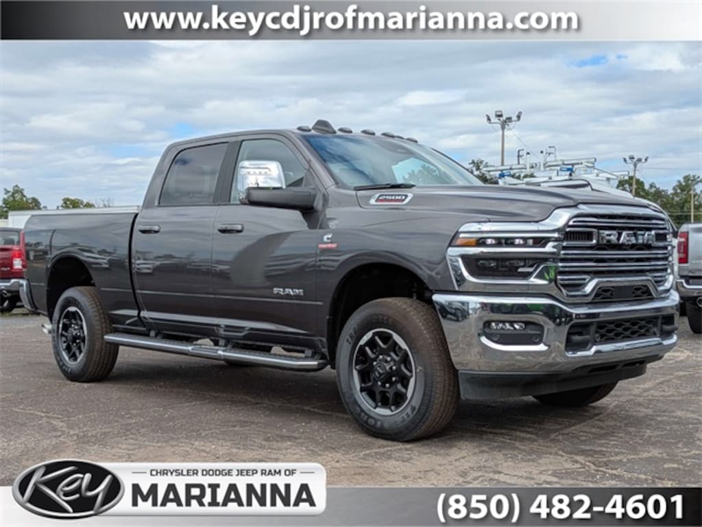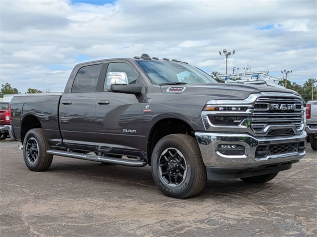 This 2500 Laramie is nicely equipped with Bed Convenience Group (LED Bed Lighting and MOPAR Spray In Bedliner), Chrome Bumper Package (Bright Front Bumper and Bright Rear Bumper), Laramie Level 1 Equipment Group (2nd Row In Floor Storage Bins, Anti-Spin Differential Rear Axle, Auto Adjust In Reverse Exterior Mirrors, Auto Dim Exterior Mirror, Auto High Beam Headlamp Control, Auto Power-Folding Mirrors, Auto-Dimming Exterior Passenger Mirror, Chrome Exterior Mirrors, Exterior Mirrors Courtesy Lamps, Exterior Mirrors w/Heating Element, Exterior Mirrors w/Memory, Exterior Mirrors w/Supplemental Signals, Foam Bottle Insert (Door Trim Panel), Forward & Reverse Utility Lights, Mirror Running Lights, Power Adjust Mirrors, Power Adjustable Convex Aux Mirrors, Power Adjustable Pedals w/Memory, Power Heated Fold Telescopic Mirrors w/Memory, Power Telescoping Mirrors, Rain Sensitive Windshield Wipers, and Remote Tailgate Release), Quick Order Package 24H Laramie, 10 Speakers, 115V Auxiliary Rear Power Outlet, 2 Way Rear Headrest Seat, 4 Way Front Headrests, 4-Wheel Disc Brakes, 4G LTE Wi-Fi Hot Spot, 5th Wheel/Gooseneck Towing Prep Group, ABS brakes, Air Conditioning, Alexa Built-In, Alloy wheels, AM/FM radio: SiriusXM with 360L, Apple CarPlay, Apple CarPlay/Android Auto, Auto-dimming Rear-View mirror, Automatic temperature control, Black Wheel Center Hub, Brake assist, Bumpers: body-color, Chrome Flat Wheel-to-Wheel Side Steps, Clearance Lamps, Compass, Connected Travel & Traffic Services, Connectivity - US/Canada, Dash Pass Thru Wire Circuits, Delay-off headlights, Disassociated Touchscreen Display, Driver door bin, Driver vanity mirror, Dual front impact airbags, Dual front side impact airbags, Electronic Stability Control, Emergency Vehicle Alert System (EVAS), Folding Flat Load Floor Storage, Front anti-roll bar, Front Center Armrest w/Storage, Front dual zone A/C, Front fog lights, Front reading lights, Front Seat Back Map Pockets, Fully automatic headlights, Garage door transmitter, Global Telematics Box Module (TBM), Google Android Auto, GPS Antenna Input, HD Radio, Heated door mirrors, Heated Front Seats, Heated front seats, Heated Steering Wheel, Heated steering wheel, High Back Seats, I/P Mounted Auxiliary Switches, Illuminated entry, Integrated Voice Command w/Bluetooth, Leather Trim 40/20/40 Bench Seat, Low tire pressure warning, MOPAR Front & Rear Rubber Floor Mats, Navigation System, Occupant sensing airbag, Outside temperature display, Overhead airbag, Overhead console, Panic alarm, ParkView Rear Back-Up Camera, Passenger door bin, Passenger vanity mirror, Power 2-Way Driver Lumbar Adjust, Power 2-Way Passenger Lumbar Adjust, Power Adjust 8-Way Driver Seat, Power Adjust 8-Way Front Passenger Seat, Power door mirrors, Power driver seat, Power passenger seat, Power steering, Power windows, Radio data system, Radio: Uconnect 5 Nav w/12.0" Display, Rear 60/40 Folding Seat, Rear anti-roll bar, Rear reading lights, Rear seat center armrest, Rear step bumper, Rear window defroster, Remote keyless entry, Security system, Selectable Tire Fill Alert, SiriusXM Radio Service, Speed control, Split folding rear seat, Steering wheel mounted audio controls, Tachometer, Tilt steering wheel, Traction control, Trip computer, Turn signal indicator mirrors, Variably intermittent wipers, Voltmeter, and Wheels: 18" x 8.0" Diam Cut Alum w/Blk Pt Pock.