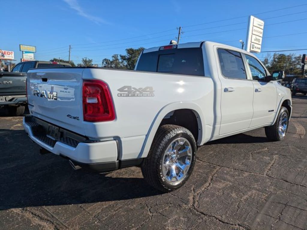 This 1500 Big Horn/Lone Star is nicely equipped with Bed Utility Group (Exterior 115V AC Outlet, MOPAR 4 Adjustable Cargo Tie-Down Hooks, MOPAR Spray in Bedliner, and Pick-Up Box Lighting), Big Horn Level 1 Equipment Group (115V Auxiliary Power Outlet, 2nd Row in Floor Storage Bins, 3 Rear Seat Head Restraints, 4 Way Front Headrests, 400W Inverter, Auto Power-Folding Mirrors, Auto-Dimming Exterior Driver Mirror, Auto-Dimming Rear-View Mirror, Black Exterior Mirrors, Black Premium Power Mirrors, Body Color Fender Flares, Bucket Seats, Center Console Parts Module, Convex Wide-Angle Exterior Mirror Insert, Deluxe Cloth Bucket Seats, Exterior Mirrors Courtesy Lamps, Exterior Mirrors with Heating Element, Exterior Mirrors with Supplemental Signals, Front Seat Back Map Pockets, Full Length Floor Console, Glove Box Lamp, Heated Front Seats, Heated Steering Wheel, Leather Wrapped Steering Wheel, Manual Adjust 4-Way Front Passenger Seat, Power 2-Way Driver Lumbar Adjust, Power Adjust 8-Way Driver Seat, Power Adjustable Pedals, Rear 60/40 Folding Seat, Rear Center Armrest, Rear Dome with on/Off Switch Lamp, Rear Power Sliding Window, Rear Window Defroster, SiriusXM Radio Service, SiriusXM Satellite Radio, Steering Wheel Mounted Audio Controls, Sun Visors with Illuminated Vanity Mirrors, and Universal Garage Door Opener), Off Road Group (E-Locker Rear Axle, Front Extra Heavy Duty Shock Absorbers, Off Road Decals, Raised Ride Height, Rear Extra Heavy Duty Shock Absorbers, Selec-Speed Control, and Tow Hooks), Quick Order Package 27Z Big Horn, Sport Appearance Package (Black Interior Accents, Body Color Door Handles, Body Color Front Bumper, Body Color Rear Bumper with Step Pads, Body Color Tailgate Handle, Grille Surround 1 Body Color Texture 1 Black, and RAM Grille Badge - Chrome), 33 Gallon Fuel Tank, 4-Wheel Disc Brakes, 48V Belt Starter Generator, 4G LTE Wi-Fi Hot Spot, 6 Speakers, ABS brakes, Air Conditioning, Alloy wheels, AM/FM radio, Apple CarPlay, Apple CarPlay/Android Auto, Auto High-beam Headlights, Brake assist, Bumpers: chrome, Cloth Bucket Seats, Compass, Connectivity - US/Canada, Delay-off headlights, Driver door bin, Dual front impact airbags, Dual front side impact airbags, Electronic Stability Control, Front anti-roll bar, Front Bucket Seats, Front Center Armrest w/Storage, Front fog lights, Front reading lights, Front wheel independent suspension, Fully automatic headlights, Global Telematics Box Module, Google Android Auto, GPS Antenna Input, Heated door mirrors, Illuminated entry, Integrated Center Stack Radio, Integrated Voice Command with Bluetooth, Low tire pressure warning, Manual Adjust 4-Way Driver Seat, Manual Folding Exterior Mirrors, Manufacturer's Statement of Origin, MOPAR Front and Rear Rubber Floor Mats, MyFlexCare Service Plan, Occupant sensing airbag, Outside temperature display, Overhead airbag, Overhead console, Panic alarm, ParkView Rear Back-Up Camera, Passenger door bin, Passenger vanity mirror, Power door mirrors, Power steering, Power windows, Radio data system, Radio: Uconnect 5 W with 8.4" Display, Rear anti-roll bar, Rear step bumper, Remote keyless entry, Speed control, Supplier Part Tracking (J-1), Tachometer, Telescoping steering wheel, Tilt steering wheel, Traction control, Trailer Brake Control, Trip computer, USB Host Flip, Variably intermittent wipers, and Voltmeter.