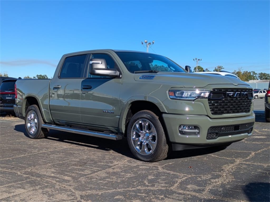 This 1500 Big Horn/Lone Star is nicely equipped with Big Horn Level 2 Equipment Group (115V Auxiliary Power Outlet, 115V Auxiliary Rear Power Outlet, 12" Touchscreen Display, 2nd Row In Floor Storage Bins, 3 Rear Seat Head Restraints, 4 Way Front Headrests, 400W Inverter, 4G LTE Wi-Fi Hot Spot, 9 Amplified Speakers w/Subwoofer, Air Conditioning ATC w/Dual Zone Control, Apple CarPlay, Auto Power-Folding Mirrors, Auto-Dimming Exterior Driver Mirror, Auto-Dimming Rear-View Mirror, Black Exterior Mirrors, Black Premium Power Mirrors, Body Color Fender Flares, Bucket Seats, Center Console Parts Module, Cluster 7.0" TFT Color Display, Configurable Drive Mode, Connected Travel & Traffic Services, Connectivity - US/Canada, Convex Wide-Angle Exterior Mirror Insert, Deluxe Cloth Bucket Seats, Disassociated Touchscreen Display, Exterior Mirrors Courtesy Lamps, Exterior Mirrors w/Heating Element, Exterior Mirrors w/Supplemental Signals, Front Seat Back Map Pockets, Full Length Floor Console, Global Telematics Box Module (TBM), Glove Box Lamp, Google Android Auto, GPS Antenna Input, GPS Navigation, HD Radio, Heated Front Seats, Heated Steering Wheel, Integrated Center Stack Radio, Integrated Voice Command w/Bluetooth, Leather Wrapped Steering Wheel, LED Dome Lamp w/On/Off Switch, LED Footwell Lighting, Manual Adjust 4-Way Front Passenger Seat, Media Hub w/2 Charge Only USBs, Overhead LED Lamps, Power 2-Way Driver Lumbar Adjust, Power Adjust 8-Way Driver Seat, Power Adjustable Pedals, Premium Overhead Console, Radio: Uconnect 5 Nav w/12.0" Display, Rear 60/40 Folding Seat, Rear Center Armrest, Rear Power Sliding Window, Rear Window Defroster, Remote Tailgate Release, Security Alarm, SiriusXM Radio Service, SiriusXM w/360L, Steering Wheel Mounted Audio Controls, Sun Visors w/Illuminated Vanity Mirrors, Universal Garage Door Opener, USB Host Flip, and Wheels: 20" x 9" Aluminum Chrome Clad (WRK)), Quick Order Package 21Z Big Horn, Sport Appearance Package (Black Interior Accents, Body Color Door Handles, Body Color Front Bumper, Body Color Rear Bumper w/Step Pads, Body Color Tailgate Handle, Grille Surround 1 Body Color Texture 1 Black, and RAM Grille Badge - Chrome), Trailer Tow Group (DISC) (Accent Color Tailgate Handle, Black Trailer Tow Power Mirrors, Manual Folding Exterior Mirrors, Manual Telescoping Mirrors, Mirror Clearance/Running Lights, Power-Adjustable Convex Aux Mirrors, Trailer Brake Control, Trailer Reverse Steering Control, Trailer Tire Pressure Monitoring System, and Trailer Tow Mirrors), 4-Wheel Disc Brakes, 48V Belt Starter Generator, 6 Speakers, ABS brakes, Air Conditioning, Alloy wheels, AM/FM radio, Apple CarPlay/Android Auto, Auto High-beam Headlights, Brake assist, Bumpers: chrome, Cloth Bucket Seats, Cluster 12" TFT Color Display, Compass, Delay-off headlights, Driver door bin, Dual front impact airbags, Dual front side impact airbags, Electronic Stability Control, Front anti-roll bar, Front Bucket Seats, Front Center Armrest w/Storage, Front fog lights, Front License Plate Bracket, Front reading lights, Front wheel independent suspension, Fully automatic headlights, Heated door mirrors, Illuminated entry, Low tire pressure warning, Manual Adjust 4-Way Driver Seat, MOPAR Front & Rear Rubber Floor Mats, Occupant sensing airbag, Outside temperature display, Overhead airbag, Overhead console, Panic alarm, ParkView Rear Back-Up Camera, Passenger door bin, Passenger vanity mirror, Power door mirrors, Power steering, Power windows, Radio data system, Radio: Uconnect 5 W w/8.4" Display, Rear anti-roll bar, Rear step bumper, Rear Underseat Compartment Storage, Rear Wheelhouse Liners, Remote keyless entry, Speed control, Supplier Part Tracking (J-1), Tachometer, Telescoping steering wheel, Tilt steering wheel, Traction control, Trip computer, Variably intermittent wipers, Voltmeter, Wheel to Wheel Side Steps, Wheels: 18" x 8" Cast-Aluminum Painted, and Wheels: 20" x 9" Aluminu