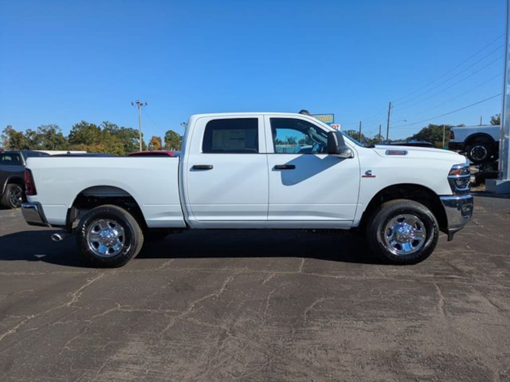 This 2500 Tradesman is nicely equipped with Bed Utility Group (LED Bed Lighting, MOPAR Deployable Bed Step, and MOPAR Spray in Bedliner), Chrome Appearance Group (115-Volt Auxiliary Front Power Outlet, 400W Inverter, Bright Front Bumper, Bright Rear Bumper, Center Hub, Chrome Grille Surround, Exterior 115V AC Outlet, Matte Black Mesh Grille with Chrome, and Wheels: 18" x 8.0" Steel Chrome Clad), Quick Order Package 24A Tradesman, 2 Way Rear Headrest Seat, 4 Way Front Headrests, 4-Wheel Disc Brakes, 40/20/40 Split Bench Seat, 4G LTE Wi-Fi Hot Spot, 5th Wheel/Gooseneck Towing Prep Group, 6 Speakers, ABS brakes, Air Conditioning, AM/FM radio: SiriusXM, Apple CarPlay, Apple CarPlay/Android Auto, Black Exterior Mirrors, Black Wheel Center Hub, Brake assist, Clearance Lamps, Compass, Connectivity - US/Canada, Delay-off headlights, Driver door bin, Dual front impact airbags, Dual front side impact airbags, Electronic Stability Control, For Details, Visit DriveUconnect.com, For More Info, Call 800-643-2112, Front anti-roll bar, Front Armrest with Cupholders, Front Center Armrest w/Storage, Front fog lights, Front reading lights, Fully automatic headlights, Global Telematics Box Module, Google Android Auto, GPS Antenna Input, Illuminated entry, Integrated Voice Command with Bluetooth, Low tire pressure warning, Manual Adjust 4-Way Driver Seat, Manual Adjust 4-Way Front Passenger Seat, Manual Folding Exterior Mirrors, Manual Telescoping Mirrors, Manufacturer's Statement of Origin, MOPAR Front and Rear Rubber Floor Mats, MyFlexCare Service Diesel, Occupant sensing airbag, Outside temperature display, Overhead airbag, Overhead console, Panic alarm, ParkView Rear Back-Up Camera, Passenger door bin, Passenger vanity mirror, Power steering, Power windows, Radio data system, Radio: Uconnect 5 with 8.4" Display, Rear anti-roll bar, Rear Folding Seat, Rear step bumper, Rear window defroster, Remote keyless entry, Remote USB Port - Charge Only, Selectable Tire Fill Alert, SiriusXM Radio Service, Speed control, Storage Tray, Tachometer, Tilt steering wheel, Traction control, Variably intermittent wipers, Voltmeter, and Wheels: 17" x 7.5" Black Steel StyleD.