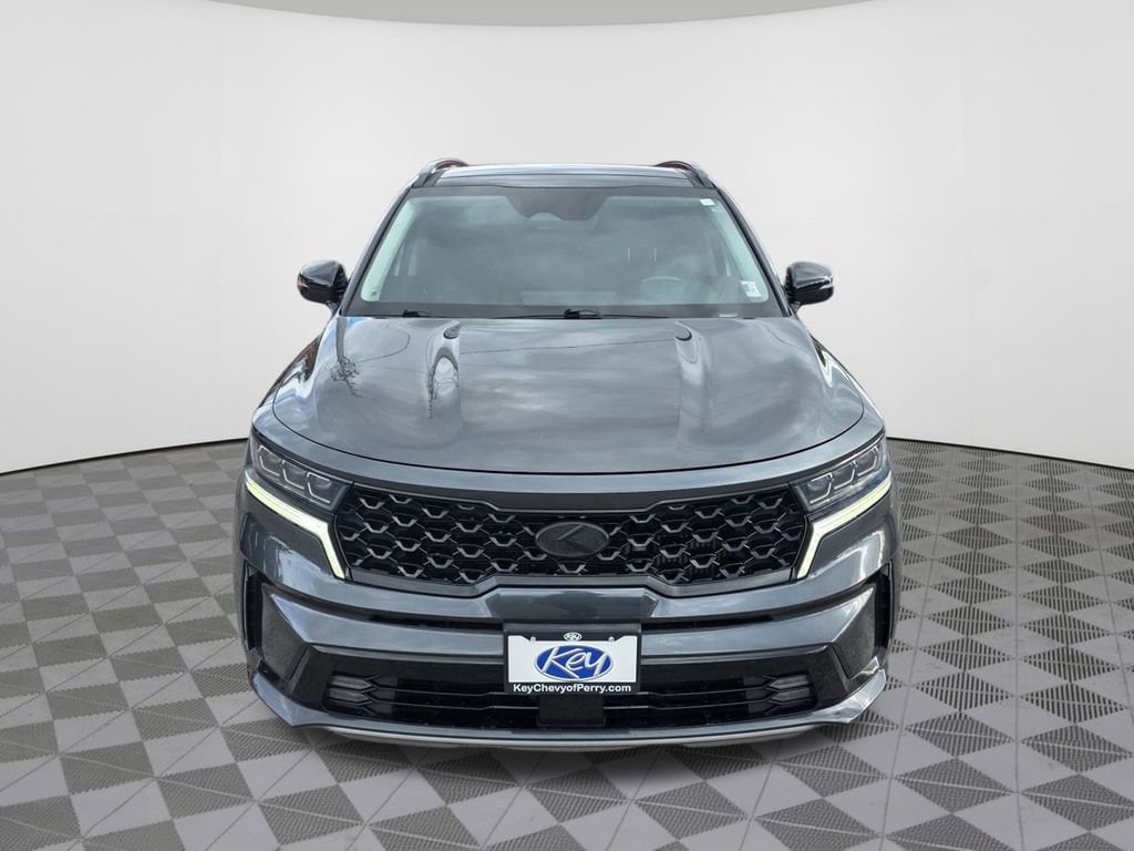 Key Chevrolet of Perry is proud to present you with another True Market Priced Pre-Owned Vehicle. This 2021 Kia Sorento SX is loaded with the following Factory Options: 3.316 Axle Ratio, 3rd row seats: split-bench, 4-Wheel Disc Brakes, 6 Speakers, ABS brakes, Air Conditioning, Alloy wheels, AM/FM radio: SiriusXM, Apple CarPlay & Android Auto, Auto High-beam Headlights, Automatic temperature control, Brake assist, Bumpers: body-color, Cargo Net, Carpeted Floor Mats, Delay-off headlights, Driver door bin, Driver vanity mirror, Dual front impact airbags, Dual front side impact airbags, Electronic Stability Control, Emergency communication system: UVO link, Exterior Parking Camera Rear, Four wheel independent suspension, Front anti-roll bar, Front Bucket Seats, Front Center Armrest, Front dual zone A/C, Front fog lights, Front reading lights, Fully automatic headlights, Heated door mirrors, Heated Front Bucket Seats, Heated front seats, Illuminated entry, Knee airbag, Leather steering wheel, Low tire pressure warning, Navigation System, Occupant sensing airbag, Outside temperature display, Overhead airbag, Overhead console, Panic alarm, Passenger door bin, Passenger vanity mirror, Power door mirrors, Power driver seat, Power Liftgate, Power moonroof, Power passenger seat, Power steering, Power windows, Premium Leatherette Seat Trim, Radio data system, Radio: AM/FM Audio System w/Navigation, Rear air conditioning, Rear anti-roll bar, Rear reading lights, Rear window defroster, Rear window wiper, Remote keyless entry, Roof rack: rails only, Security system, Smart Key w/ Push Button and Remote Start, Speed control, Speed-sensing steering, Split folding rear seat, Spoiler, Steering wheel mounted audio controls, Tachometer, Telescoping steering wheel, Tilt steering wheel, Traction control, Trip computer, Turn signal indicator mirrors, Variably intermittent wipers, Wheel Locks, and Wheels: 20 Gloss Black Alloy!! Clean CARFAX.